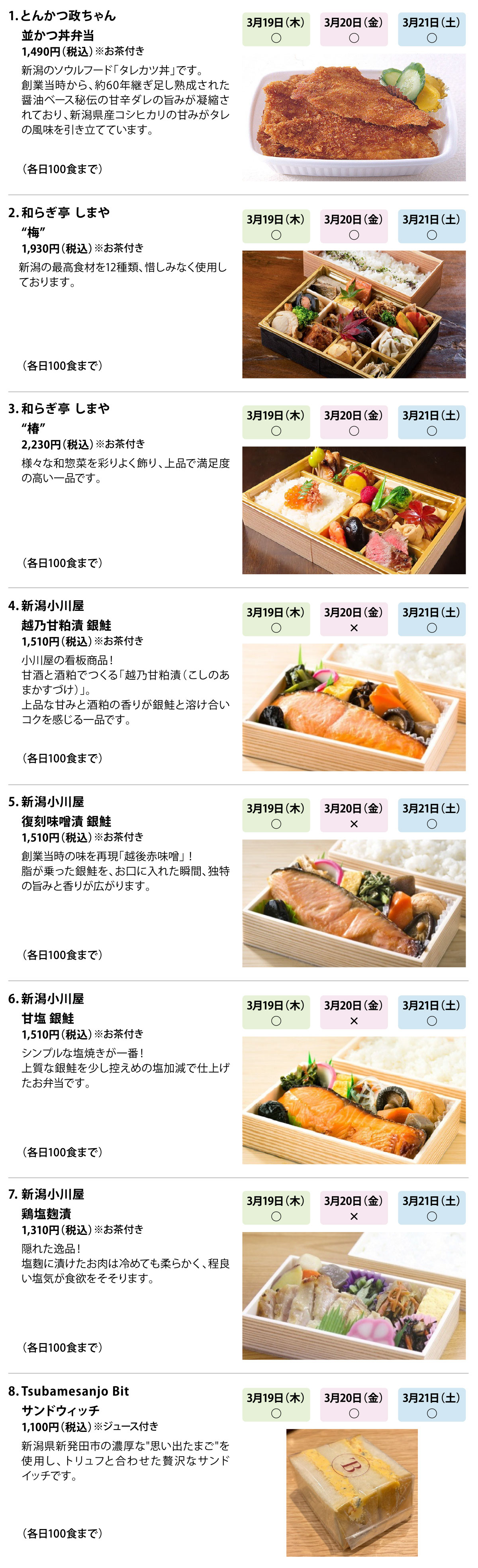 | ●3月19 日(木)11:30〜14:00 ●3月20 日(金)11:30〜14:00 ●3月21 日(土)11:30〜14:00 ※上記の時間を過ぎた場合、お弁当は事務局で処分させていただきます。 |