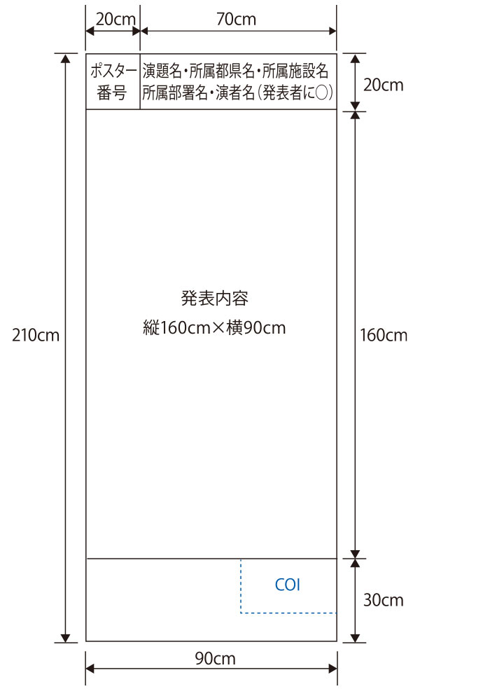 | ポスターは横90cm、縦160cmでご準備ください(下記図参照)。 演題番号は事務局にて準備しますが、演題名、氏名、所属(横70cm×縦20cm)部分は各自でご準備ください。 なお、発表内容「縦160cm×横90cm」のサイズや、COI貼付部分については概ねの位置となりますので、厳密でなくても問題ございません(必ずしも COI は下から30㎝以内に開示しなければならない、というわけではなく大体の位置で示しています)。 |